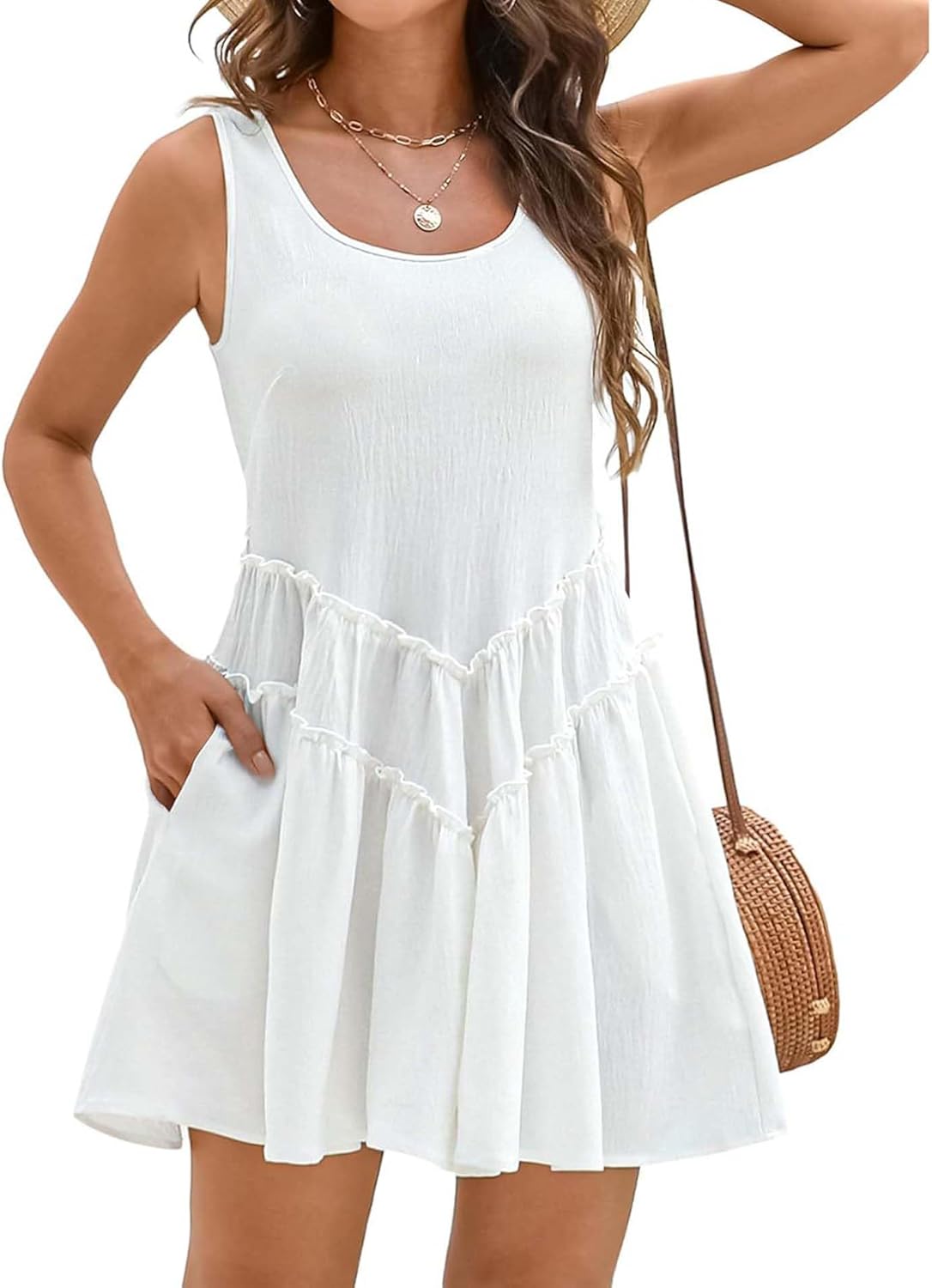Sexyshine Women's Summer Casual Sleeveless Ruffle Mini Dress Flowy Tiered Pleated Beach Cover Up Sundress with Pockets