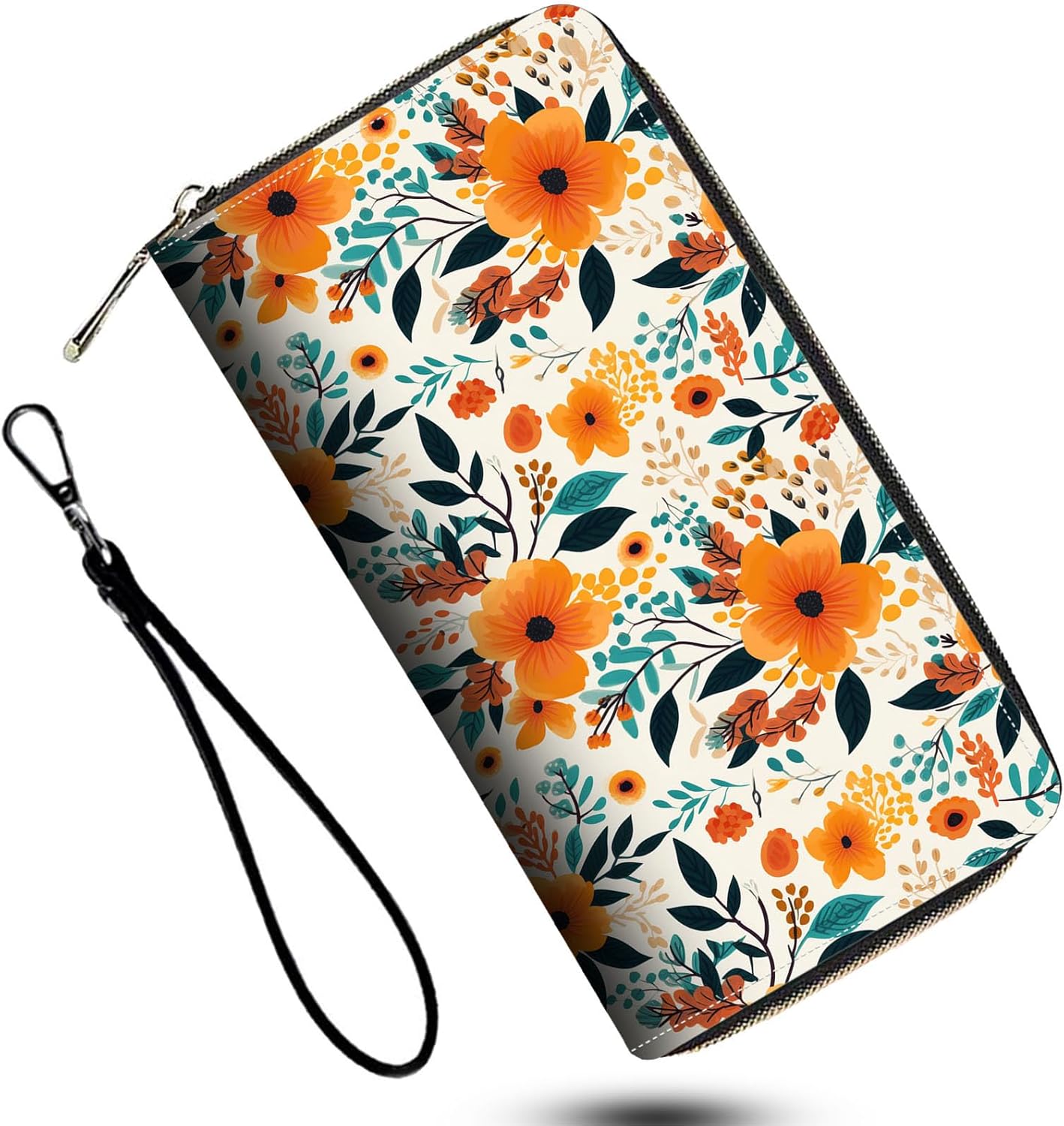 Leather Wallet for Women,Large Capacity RFID Blocking Clutch,Zip Around Purse with 8 Card Slots,Bill Compartments Coin Pocket-Beautiful Flowers