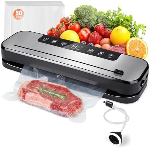 Vacuum Sealer for Food, 75KPA Suction Food Saver with Dry/Moist Modes & Digital Timer, Food Saver Vacuum Sealers Machine with 50 bags, Ideal for Home Kitchen Use (50 Pcs)