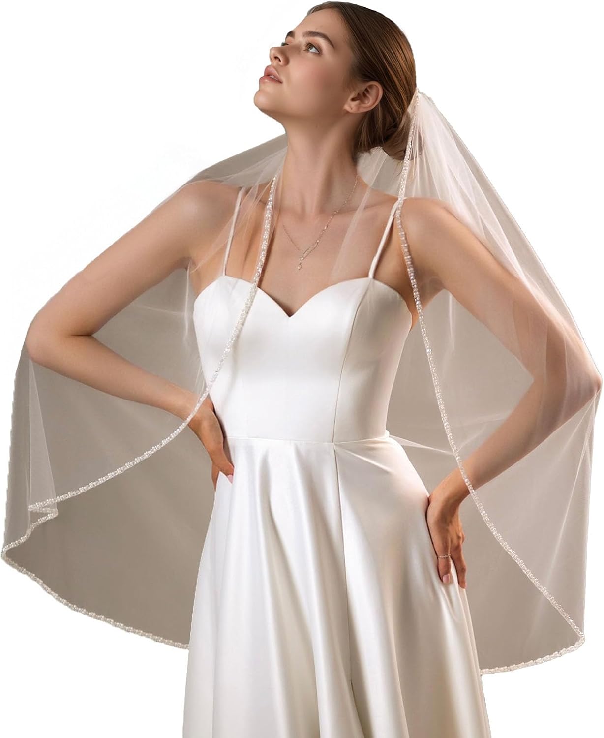 Wedding Veil Fingertip Length Bridal Veil Pearl Beaded Edge Wedding Veils with Comb