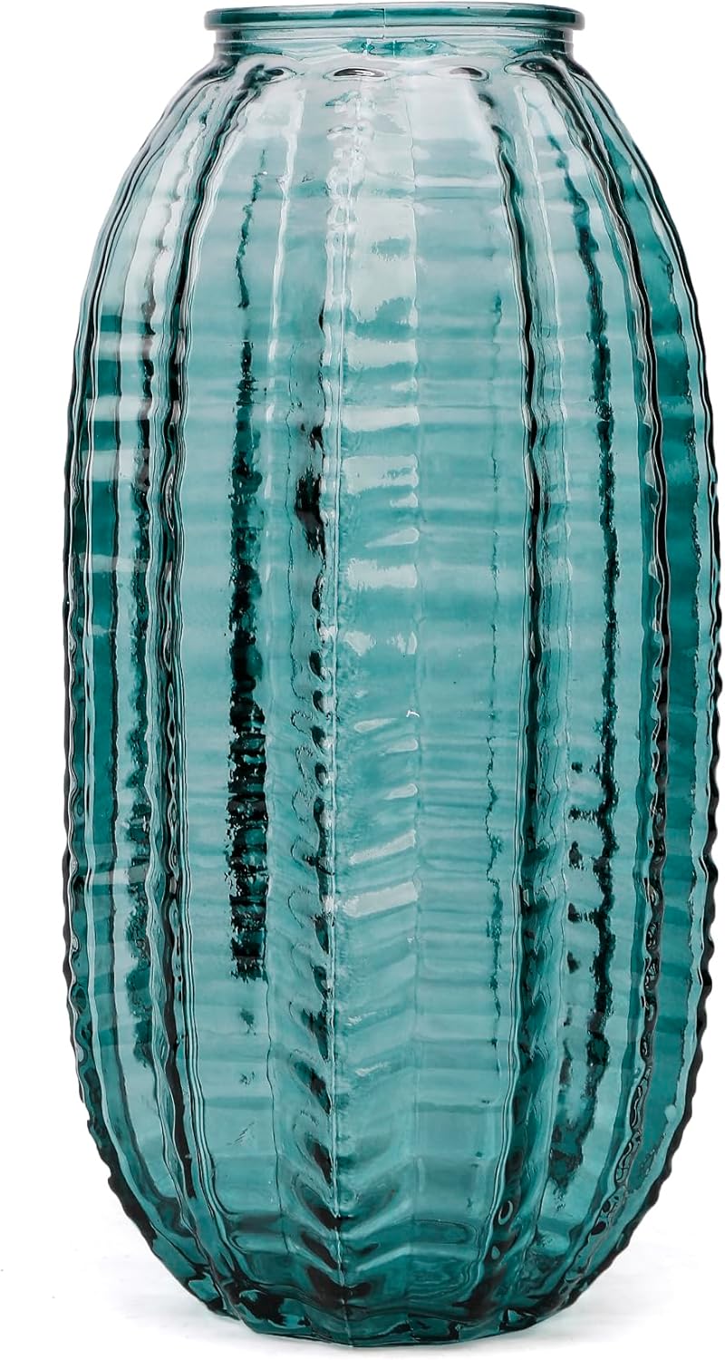 Unique Cylinder Shaped Green Glass Flower Vase-9.8 inch Tall,Simple Striped Design for Home Decor,Centerpieces, Wedding, Dining Table, Arrangement.
