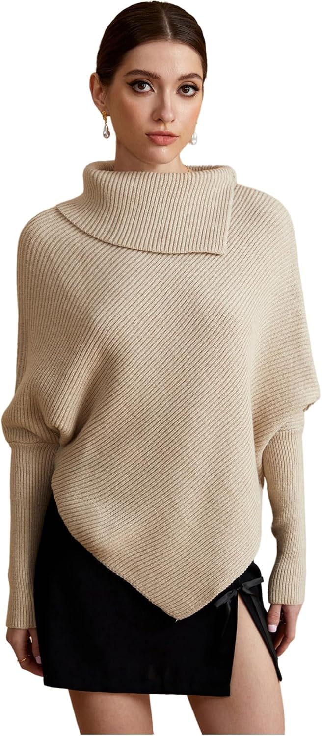 Women's Turtleneck Asymmetrical Sweater Poncho Top Dolman Long Sleeve Knit Pullover Tops