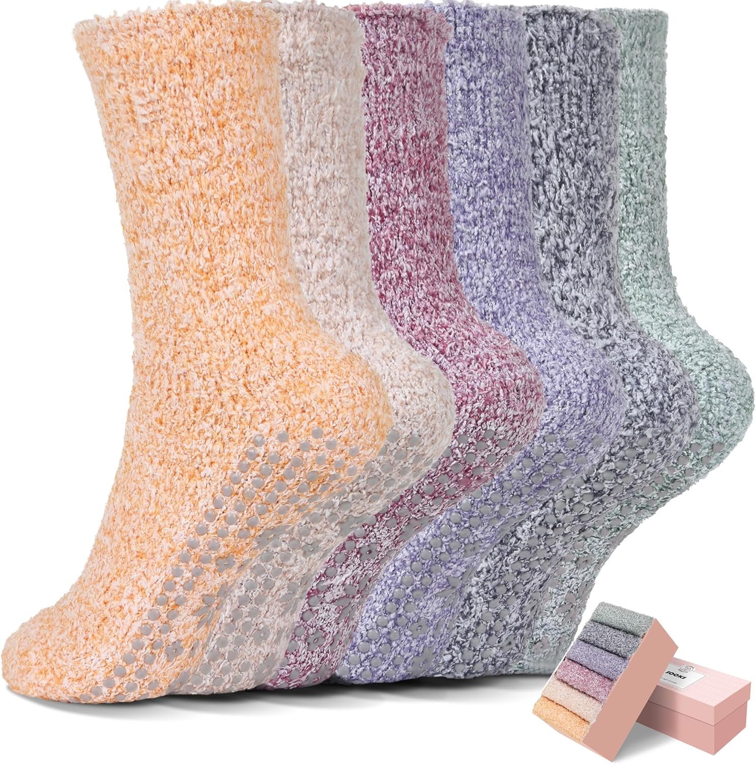HUGSWEET 6 Pairs Thick Fuzzy Socks with Grip Cozy Non Slip Hospital Socks Home Fluffy Warm Slipper Socks Gifts for Women