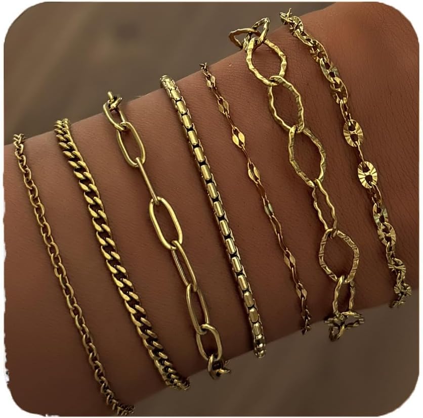 Gold Bracelets for Women,14K Gold Dainty Bracelet Set Thin Stackable Trendy Cuban Link Paperclip Chain Bracelet Pack Fashion Summer Jewelry Gifts