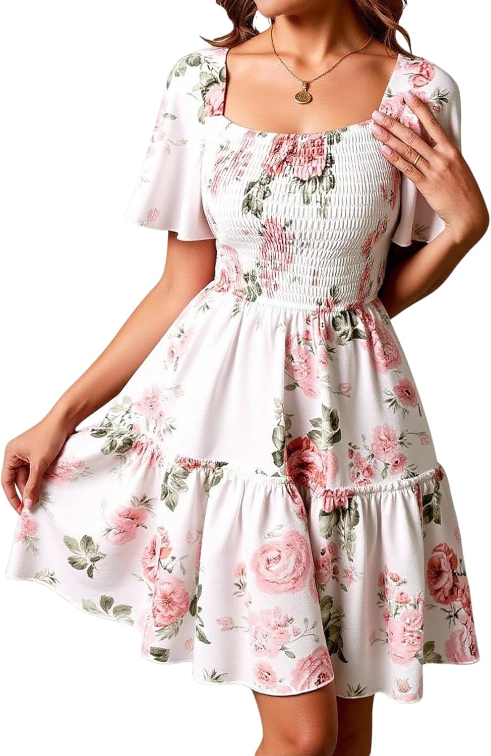 Women's Boho Floral Mini Dress Ruffle Square Neck A Line Flowy Sundress Beach Vacation Clothes