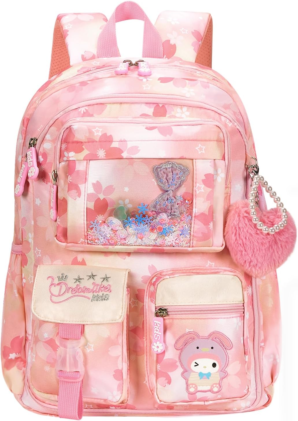 Kids Backpack for Girls, Cartoon School Bag for Elementary Middle School Students, Kawaii Children's Book Bag (17inch Pink)