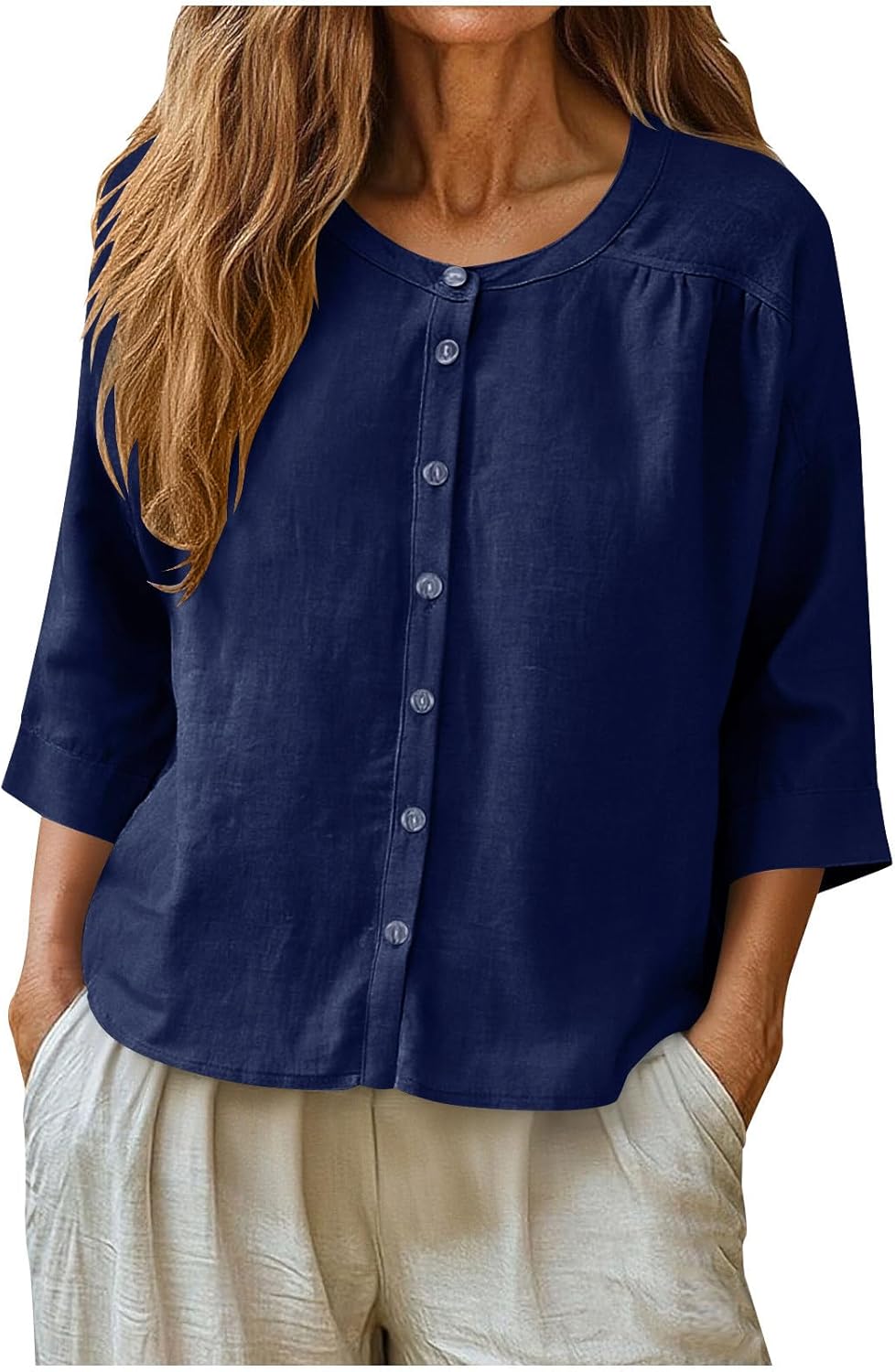 SMIDOW Summer Tshirt Shirts For Women - 3/4 Sleeve Cotton Linen Button Down Tunic Tops Casual Loose Round Neck Blouses