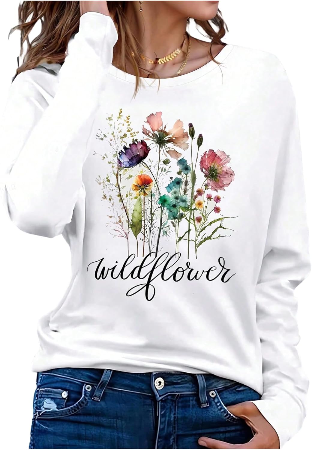 SweatyRocks Women's Floral Graphic Letter Print Long Sleeve T Shirts Round Neck Casual Tee Tops