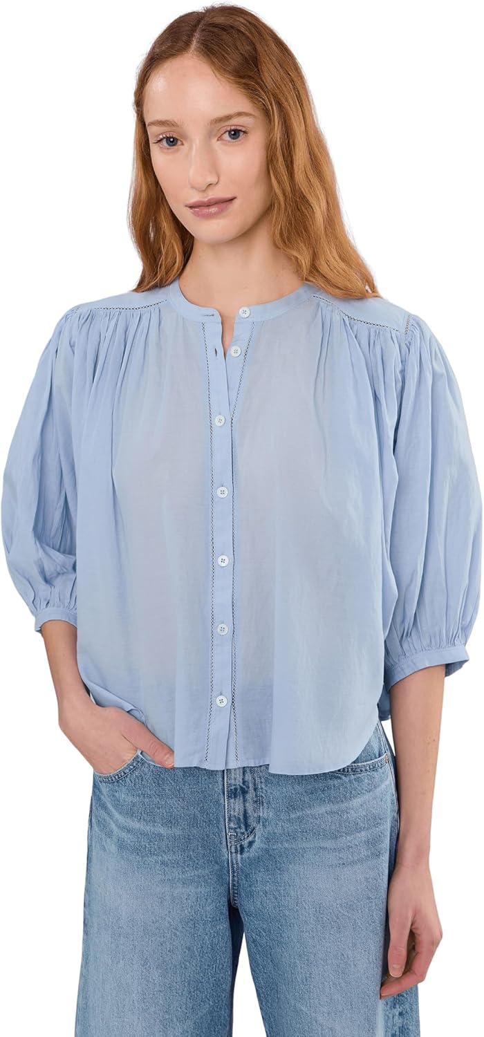 Madewell Womens Shirred Crewneck Button-up Top