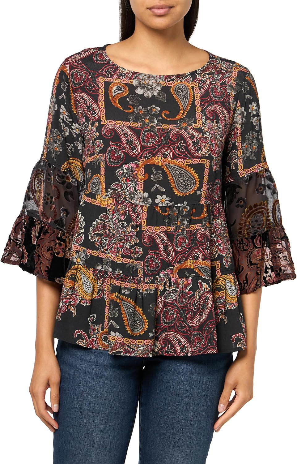 John Mark Womens Mix Media Tiered Ruffle Top with Three Quarters Flounce Sleeves