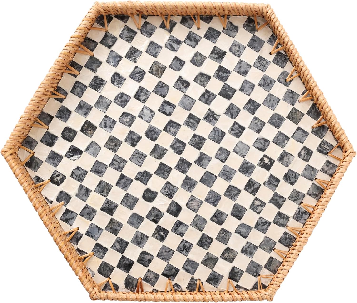 Hexagon Rattan Tray with Mother of Pearl Inlay, Rattan Serving Tray for Coffee, Bread, Fruits, Snacks, Decorative Wicker Tray for Table Decor, Home Decor (Black Checker, 14.5"×12.8")
