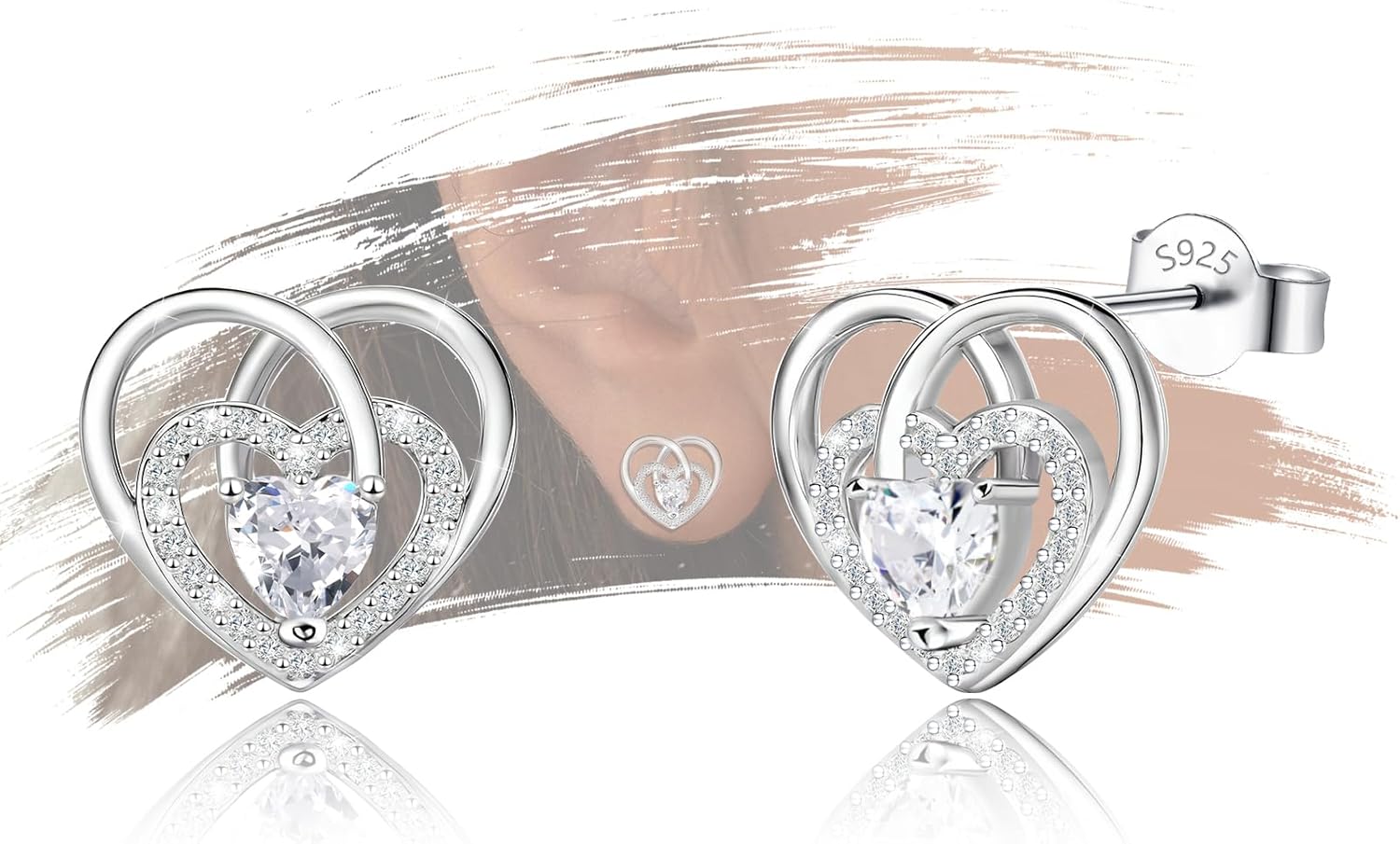 Heart Stud Earrings for Women - Sterling Silver Double Love Heart-Shaped Earrings Hypoallergenic Cubic Zirconia Hollow Post Earring Dainty Sparkle Jewelry Gifts for Her Wife Mom