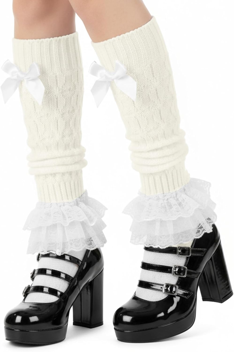 Women's Knit Leg Warmers, Y2K Bow Lace Trim Knee High Leg Sleeve Socks, Cute Harajuku Style Cute Long Chunky Knit Legs Warmer Socks for Women Girls 16.53 x 3.15 inches White