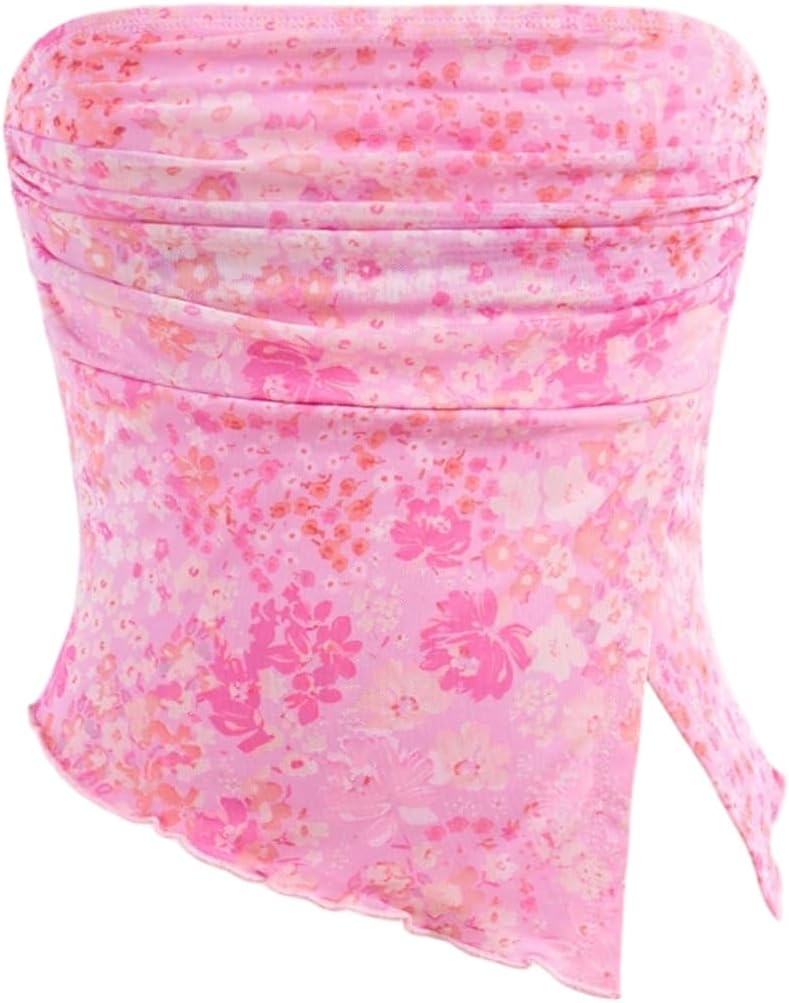 Milumia Girl's Floral Ruched Tube Top Strapless Lettuce Trim Split Hem Bandeau Tops