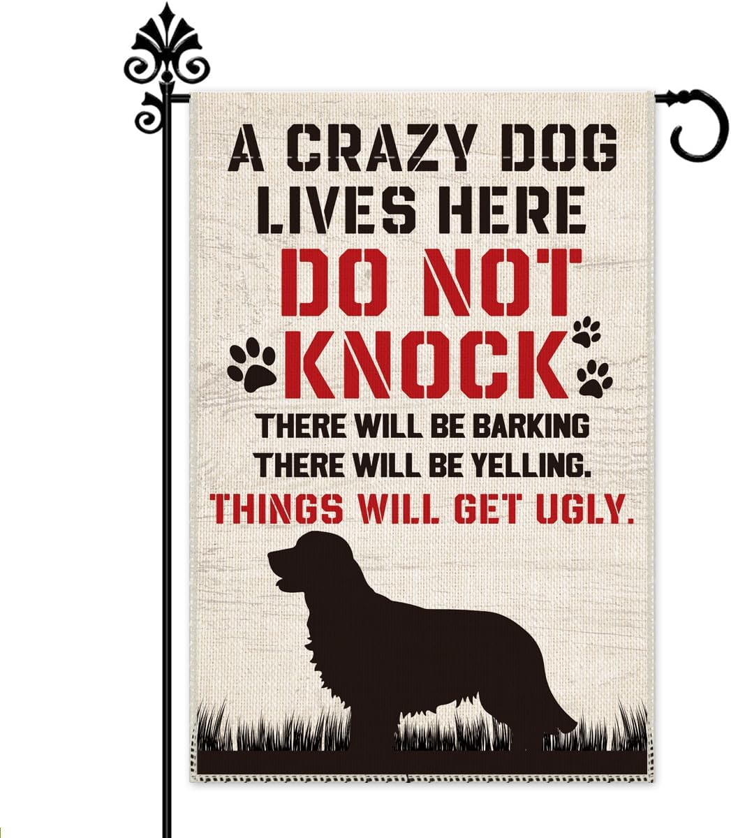 Hafhue A Crazy Dogs Live Here Do Not Knock They Will Bark Welcome Garden Flag, Yard Outdoor Farmhouse Home Decorations 12x18 In Waterproof Double Sided Printing, Funny Yard Flag Gift for Dog Lover