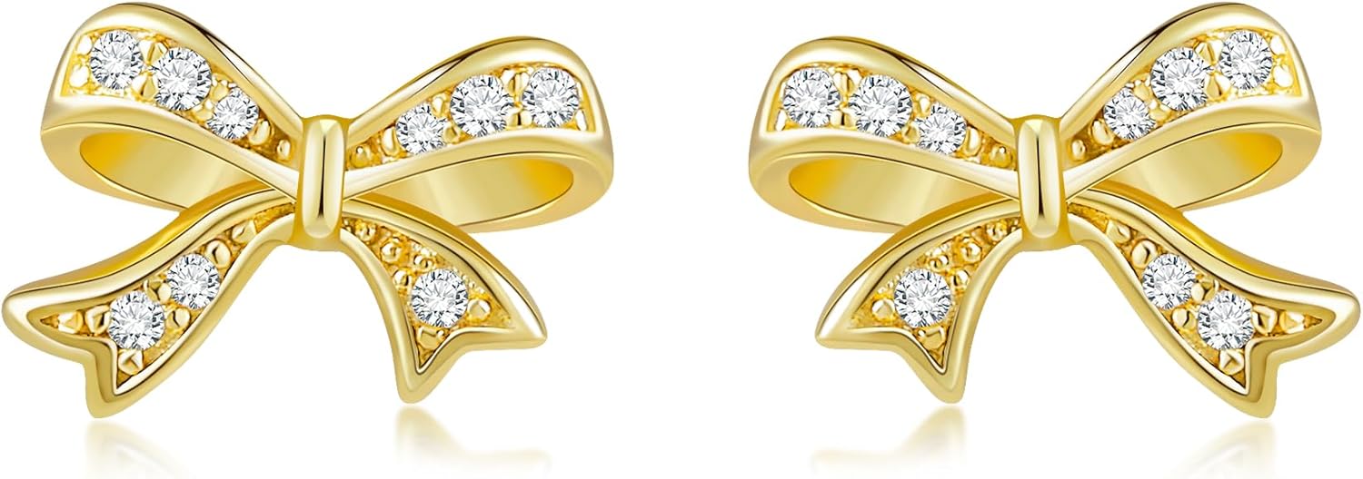 ANGELLIS 925 Sterling Silver Rhinestone Bow Earrings for Women - 14K Gold Plated Hypoallergenic Cubic Zirconia Sparkly Bow Stud Earrings for Christmas Gifts Stocking Stuffers Jewelry