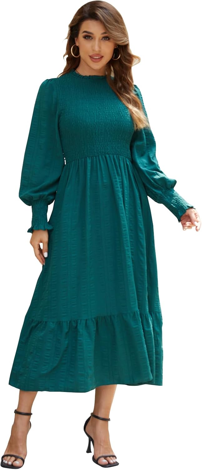 Ferrendo Women's 2026 Spring Fall Midi Dress Casual Long Sleeve Crew Neck Smocked Tiered Long Flowy Dresses with Pockets