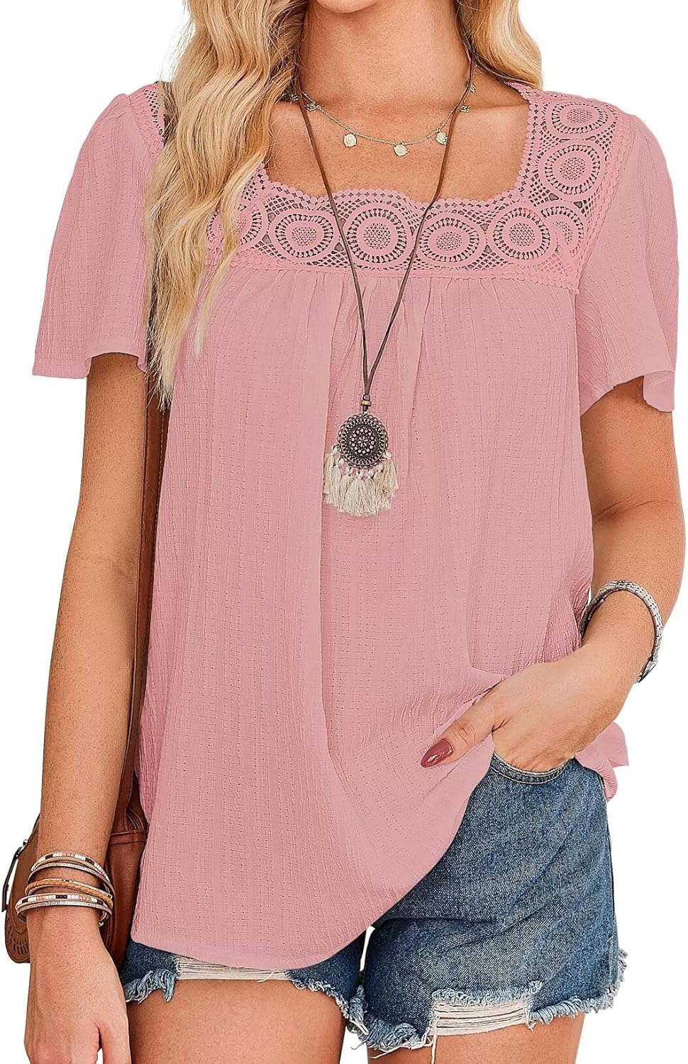 Womens Tops 2025 Boho Blouses Short Sleeve Flowy Square Neck Casual Peasant Summer Floral Lace Hem Textured Shirts