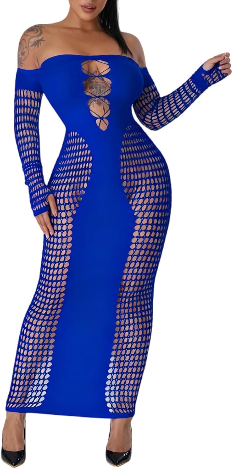 Sexy Outfit for Women Going Out Fishnet Dress See Through Mesh Hollow Out Maxi Club Dresses