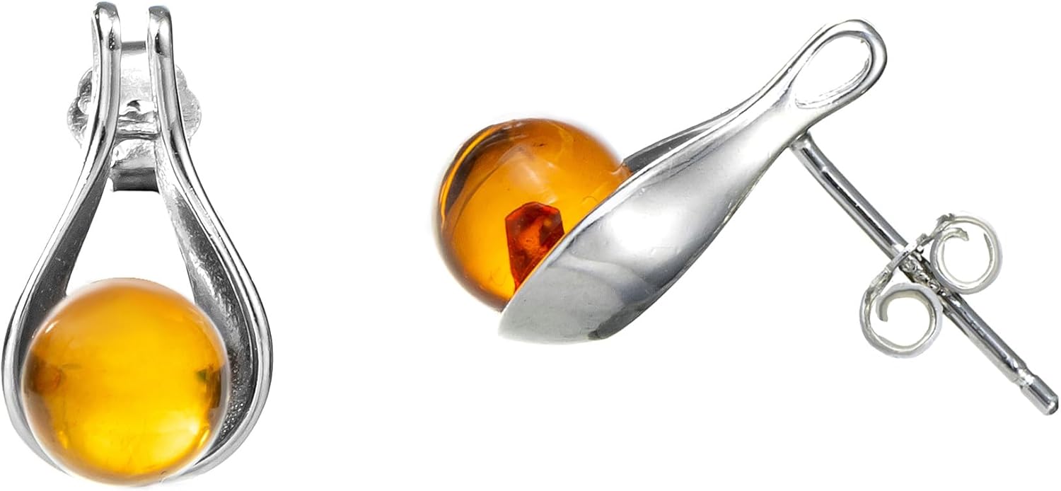 Genuine Baltic Amber Boots Stud Ball Earrings for Women in Sterling Silver, Rich Cognac Color