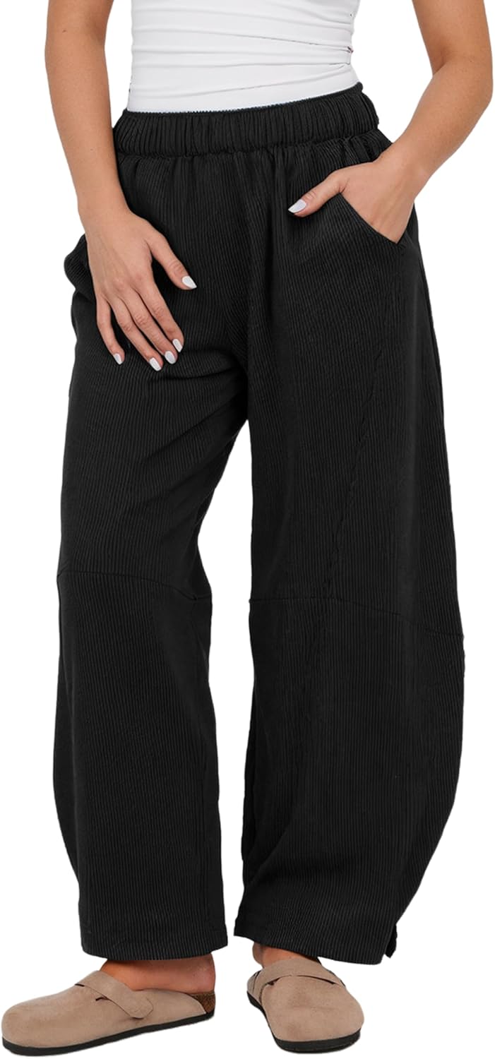 Athlisan Womens Corduroy Pants Wide Leg Cropped Barrel Baggy Elastic Waist Trousers with Pockets