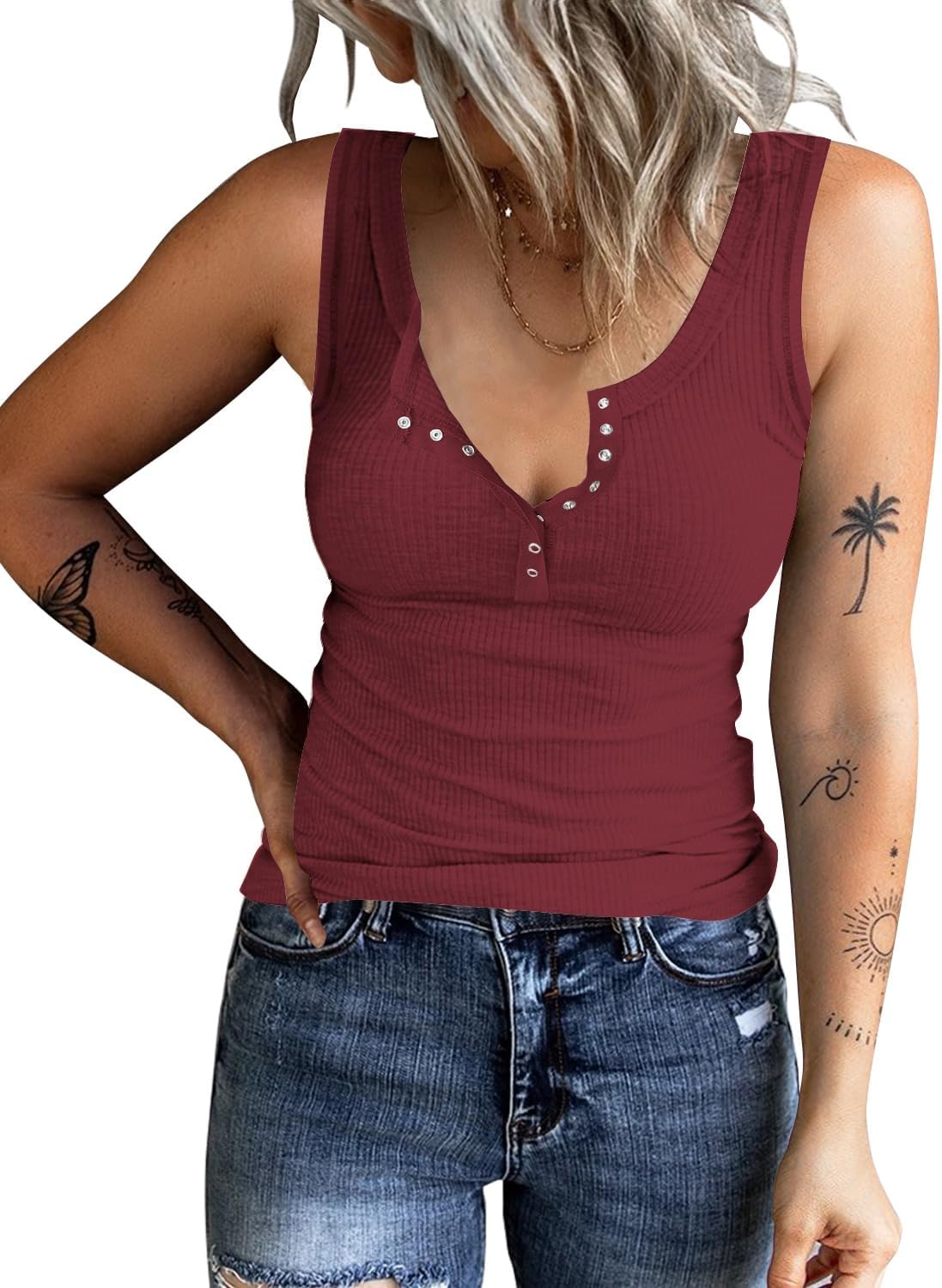 KINLONSAIR Women's Sleeveless Henley Tank Tops Summer Ribbed Button Down Casual T Shirts Slim Fit V Neck Tee Tops
