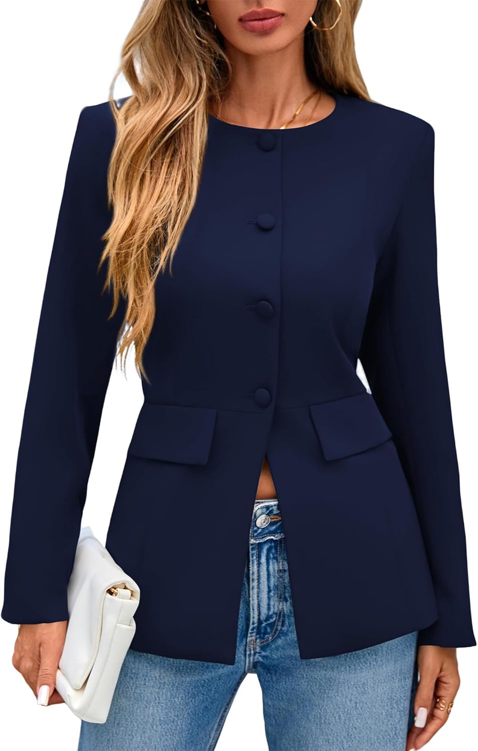 Lazysmile Blazers for Women Long Sleeve Crewneck Button Down Suit Jackets Work Office Business Casual Outfits with Pockets