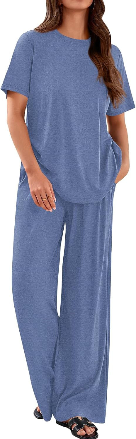 PRETTYGARDEN Spring Lounge Sets for Women 2 Piece Short Sleeve Crewneck Cute Tops and Wide Leg Pants with Pockets Pj Set