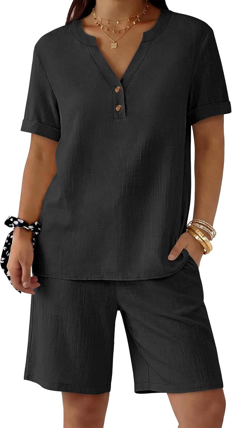 ANRABESS Women 2 Piece Linen Lounge Sets Summer Casual Henley Shirts Short Pajama Set Beach Vacation Clothes Airport Outfits