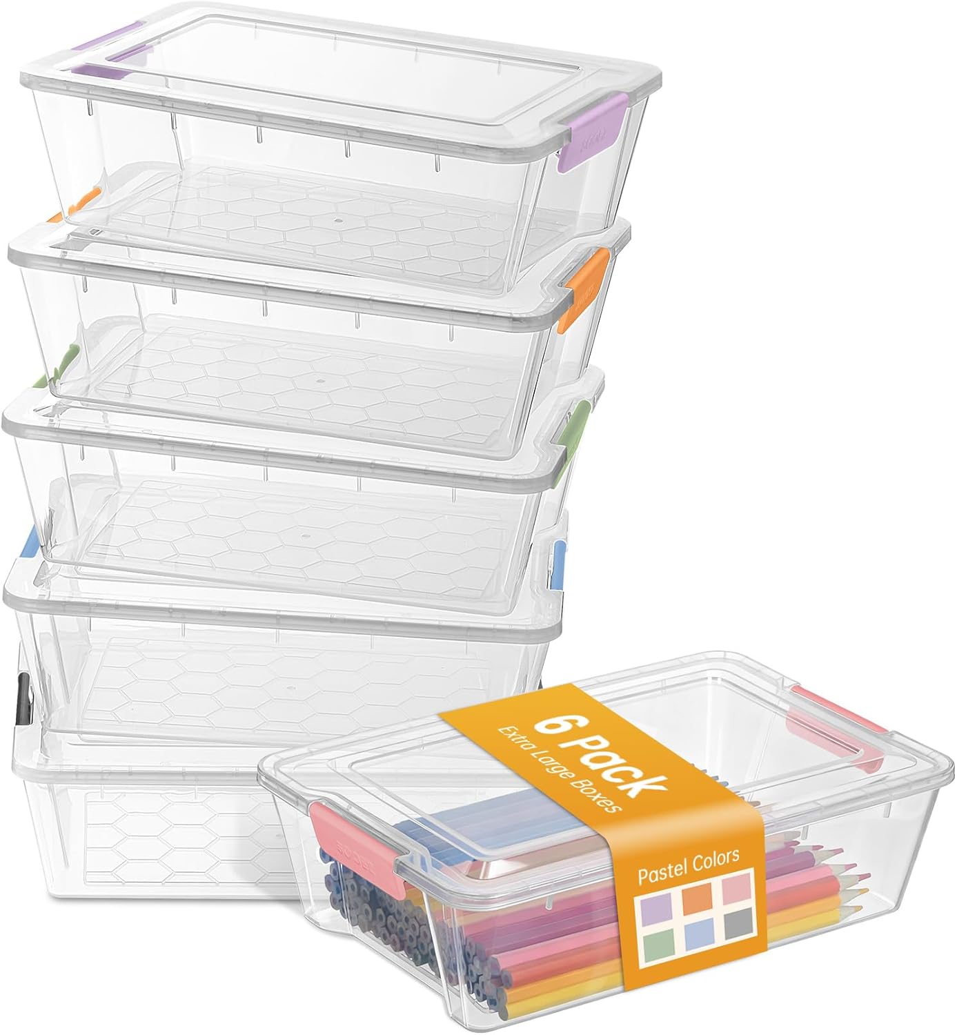 Sooez 6 Pack Pencil Boxes, New Extra Large Pencil Case, Plastic Crayon Pen Box, Clear Marker Organizer Craft Storage, Plastic Containers with Lids, Stackable Art Storage Box for School Supplies