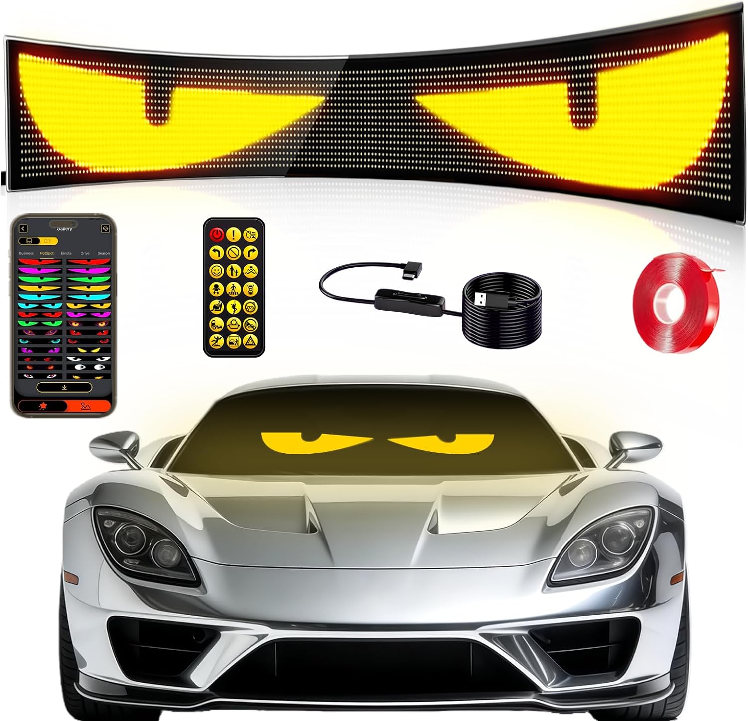 - 【Simple Installation, Plug & Play】This eye lights for car windshield is equipped with sturdy tape, it is stable once attached. You can stick the LED sign for car anywhere you want, such as car/truck windows, bedroom walls, bar counters, etc. In addition, the 4.5M ultra long power cord and 5V USB upgrade plug are designed to leave enough space for your flexible LED digital display. As long as you plug in the power and turn on the switch, the LED car eyes will immediately light up.
