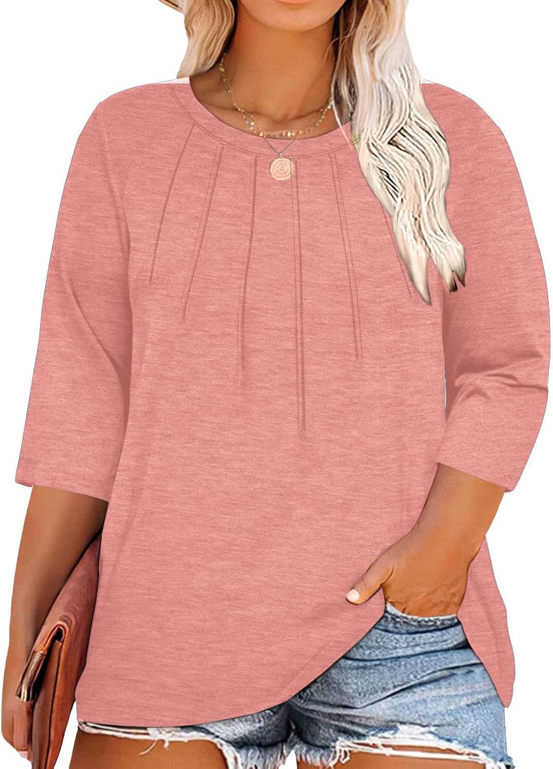 Chulianyouhuo Womens Plus Size Tops Casual 3/4 Sleeve Crewneck Pleated T Shirt Dressy Loose Tunic Blouse