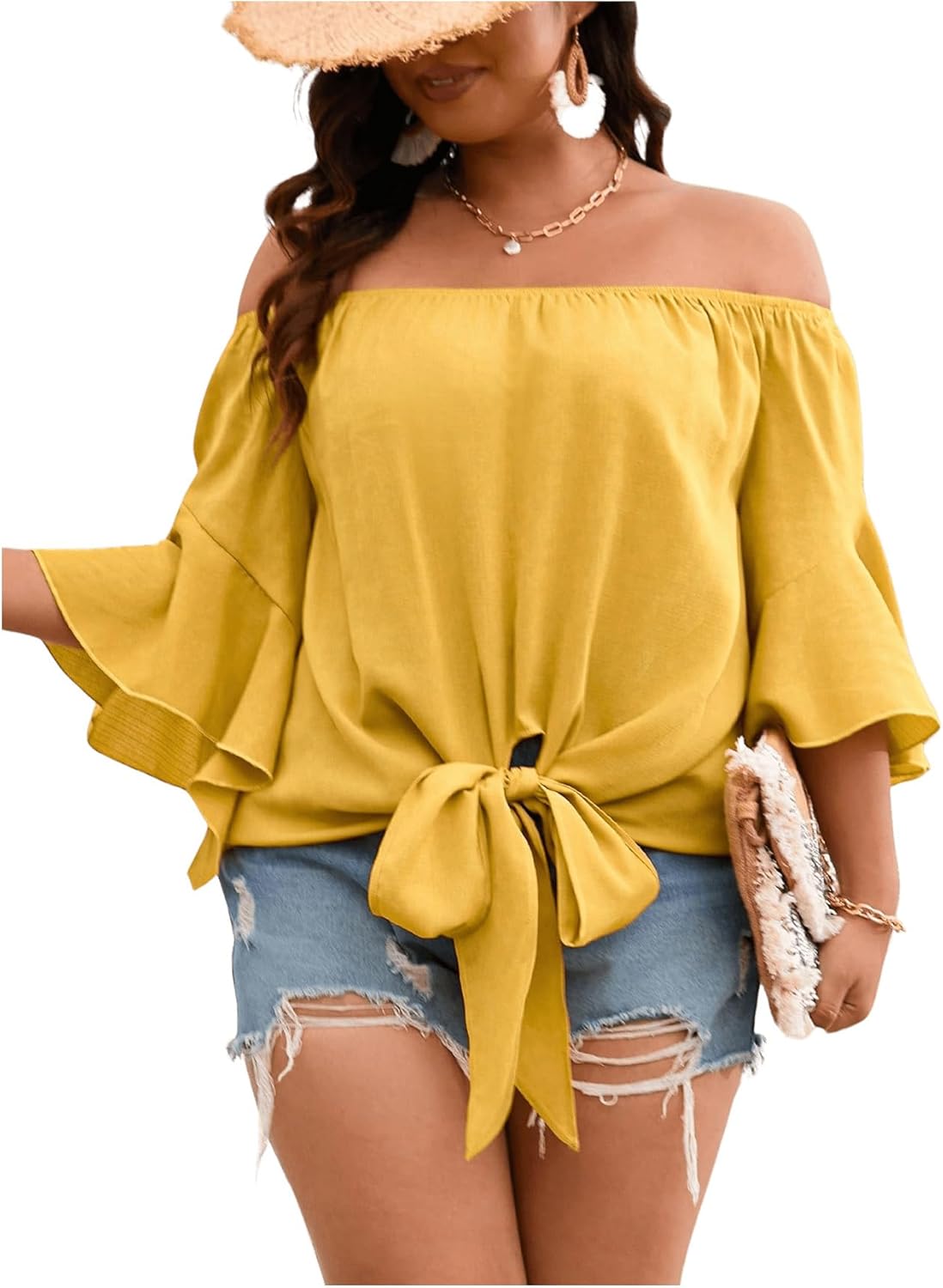 Floerns Women's Plus Size Off Shoulder 3/4 Bell Sleeve Knot Tie Front Blouses Top
