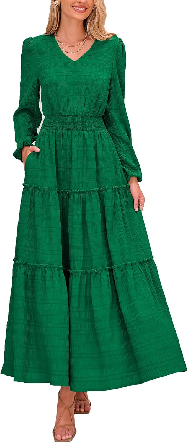 PRETTYGARDEN Women's Maxi Dress Casual Long Sleeve V Neck Smocked Waist Tiered Ruffle Flowy Cocktail Pocket Dresses