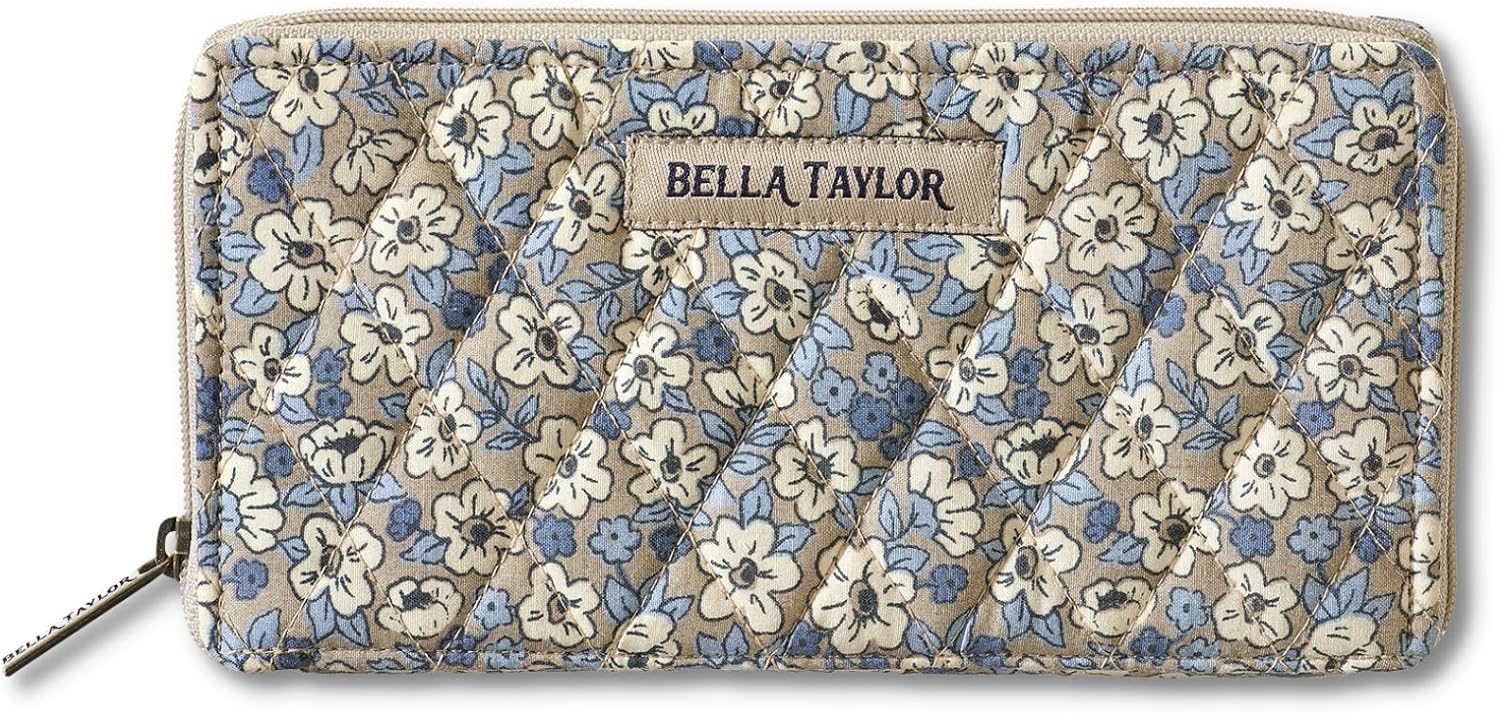 Bella Taylor Slim Card Wallet for Women | Quilted Cotton Fabric Zip Around Credit Card Wallet with RFID Protection | Khaki Floral