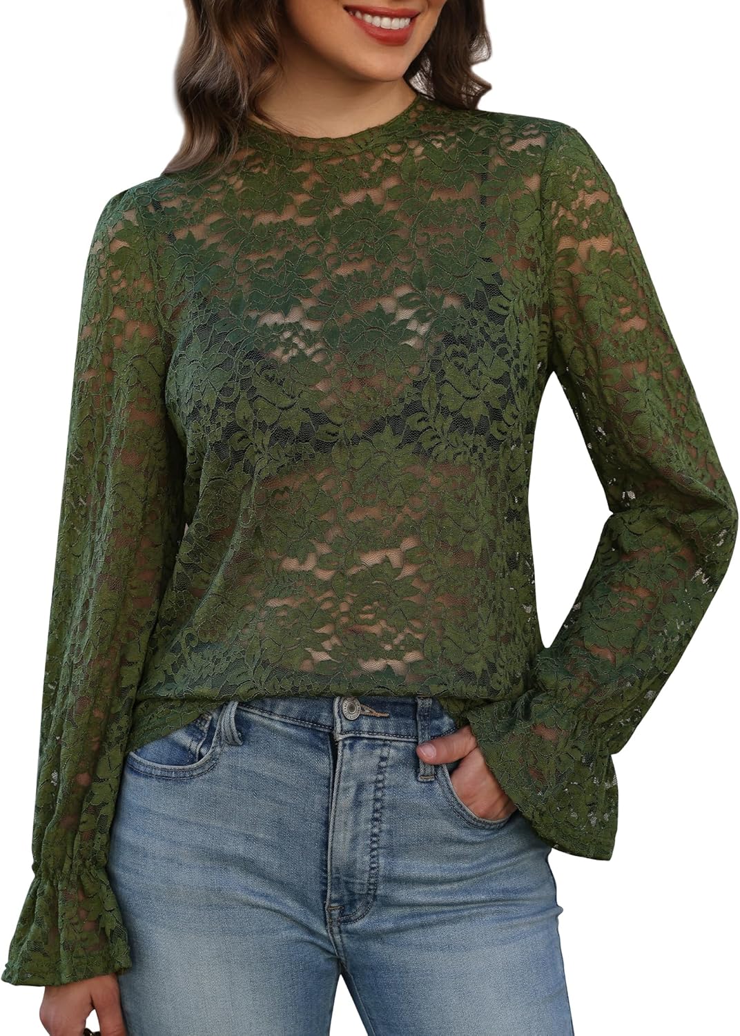 Womens Lace Long Sleeve Tops Dressy Casual Mock Neck Blouses Floral Elegant Sheer Shirts Date Night Outfits