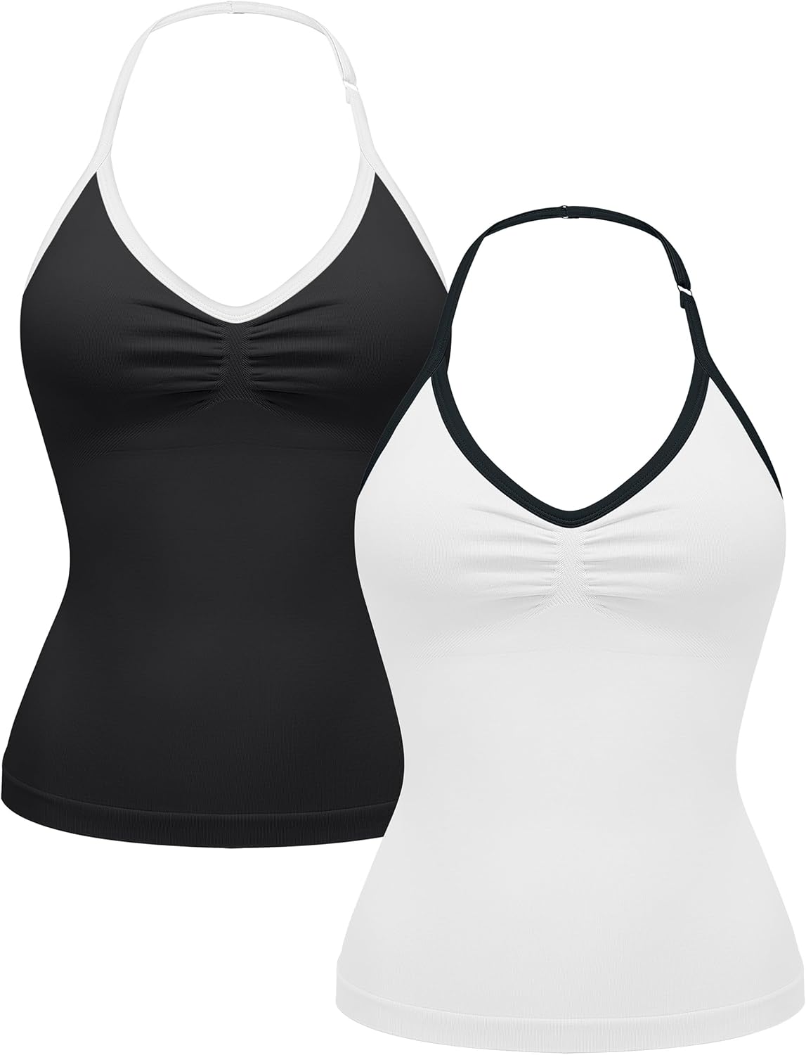 Relety Womens 2PK Halter Tank Tops V Neck Contrast Trim Impact Backless Longline Strappy Adjustable Gym Workout Top Padded