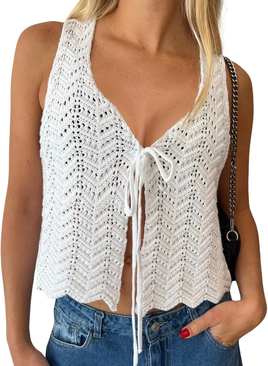 HengShunRui Women Tie Front Crochet Top Summer Boho Knit Vest Top Beach Cover Up