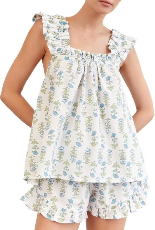 Argeousgor Womens 2 Piece Ruffle Pajama Set Floral Print Cami Top and Shorts Cute Coquette Pjs Soft Flowy Babydoll Loungewear