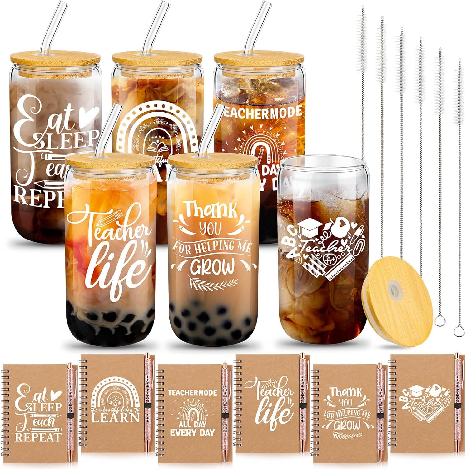 6 Sets Teacher Appreciation Week Gifts Bulk for Women Thank You Practitioner Birthday Gifts Glass Cups 16oz with Lids Straws Appreciation Notebooks Ballpoint Pens(Colorful)