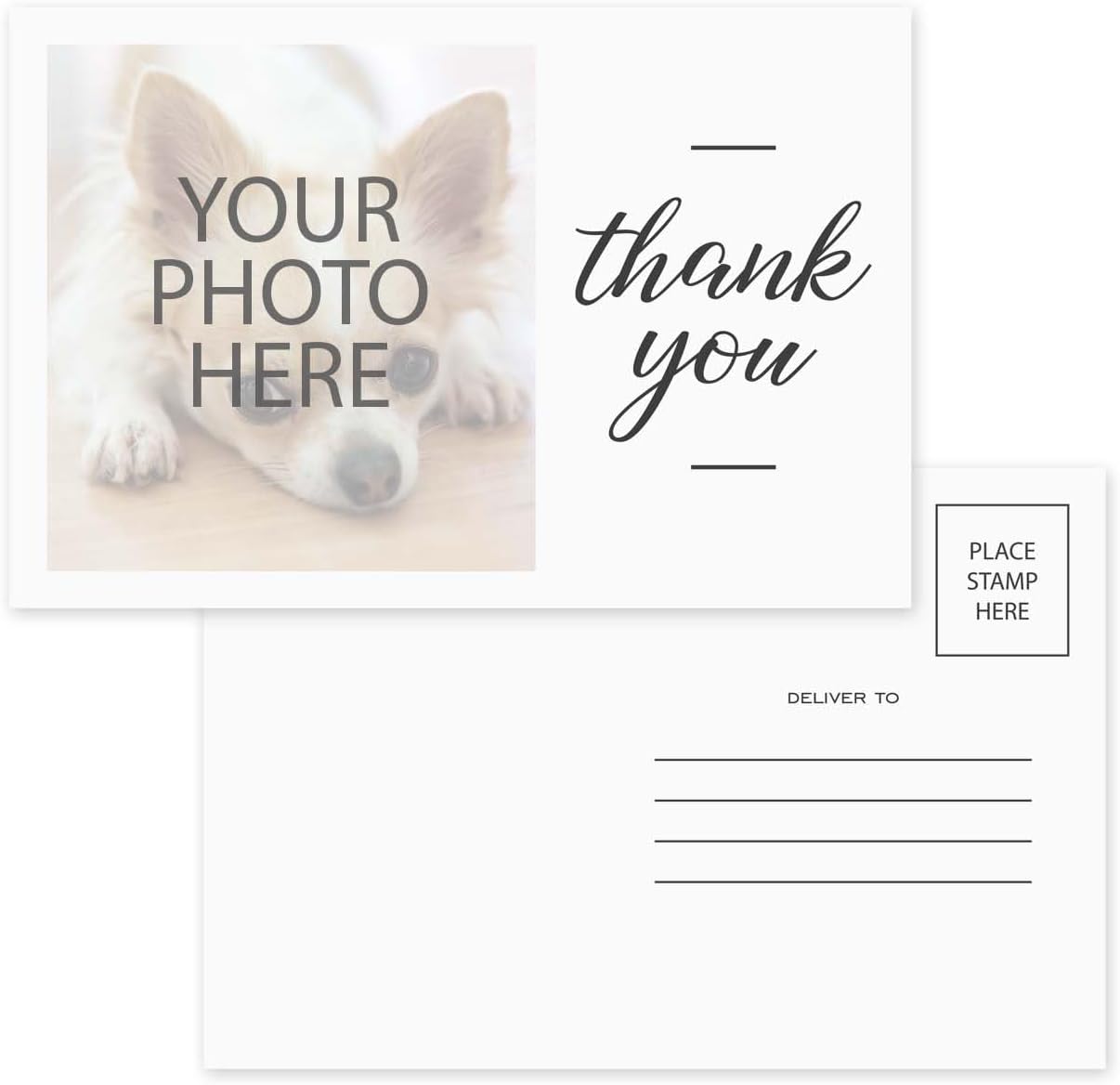 - Modern Design: Elegant script design with the words, "thank you" and space to add your own photo. Back includes room to write a special message, lines for an address, and a place for stamp. Printed in full color on both sides of high quality cardstock.