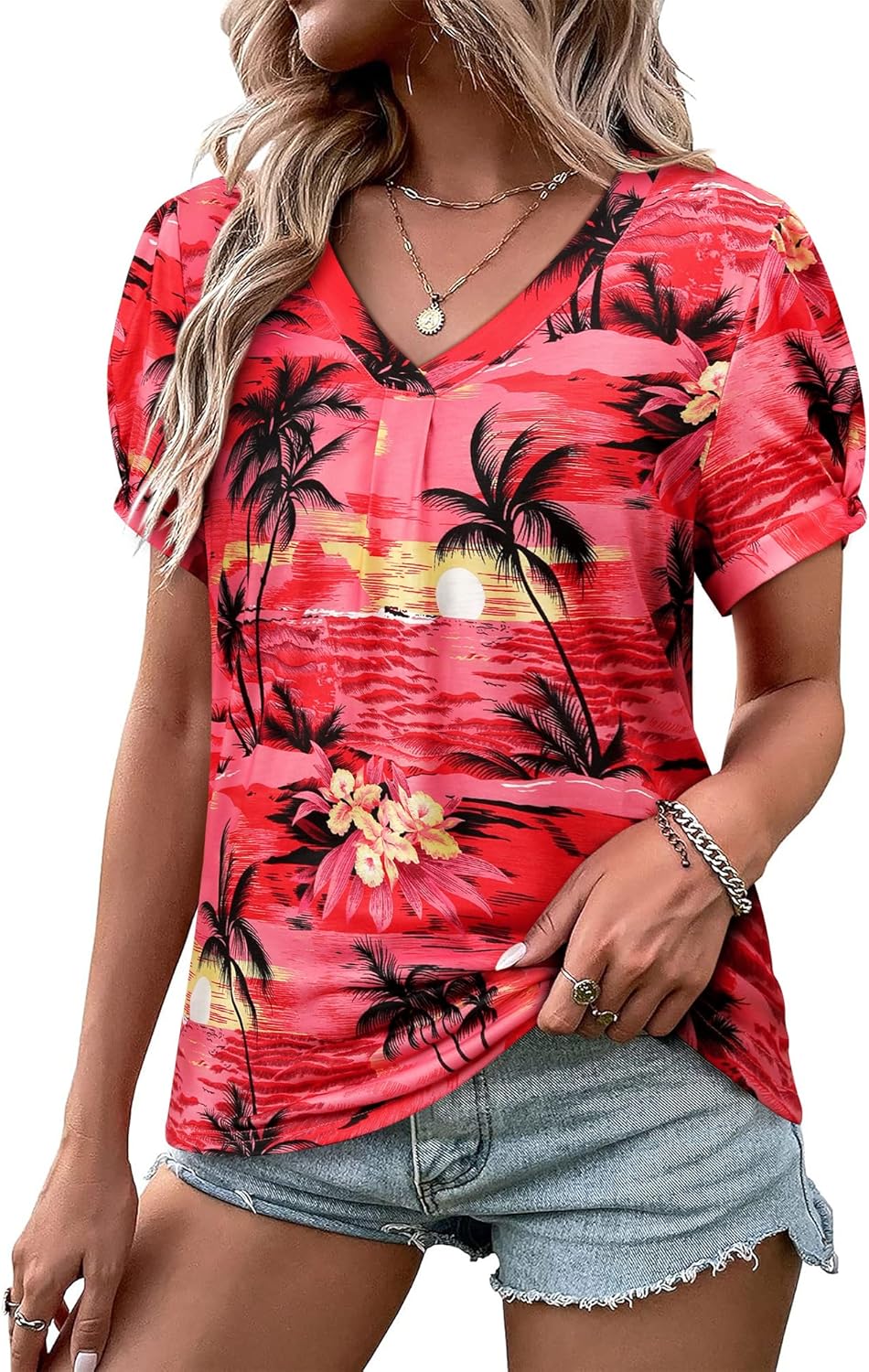 Womens Puff Short Sleeve Hawaiian Shirts Floral Tropic Printed Pleated V Neck Summer Casual T-Shirt Trendy Boho Blouses Tops