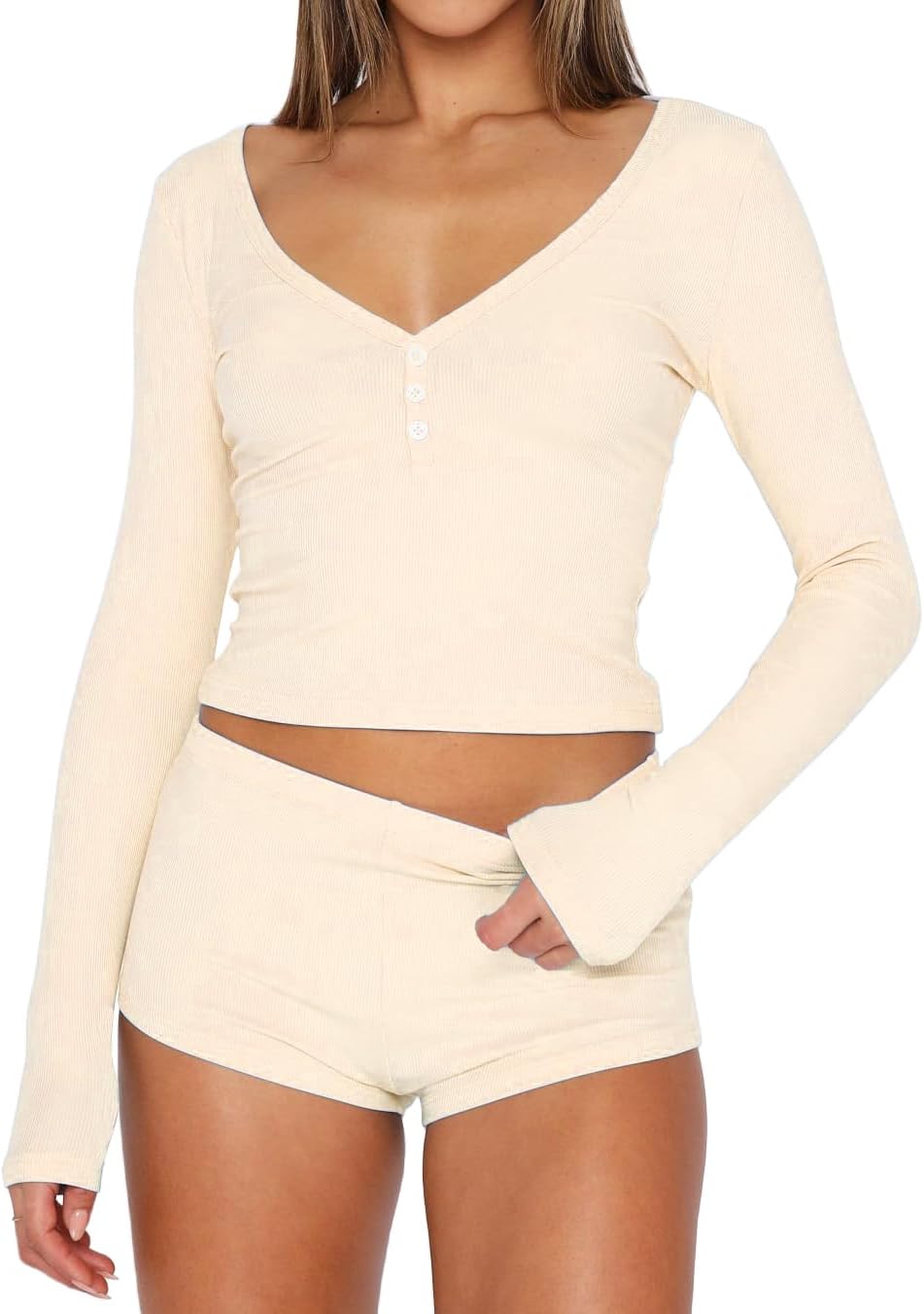 INFITTY Womens Sexy Vneck 2 Piece Sets Casual Long Sleeve Button Short Pajama Outfit 2026 Trendy Crop Top Nightwear