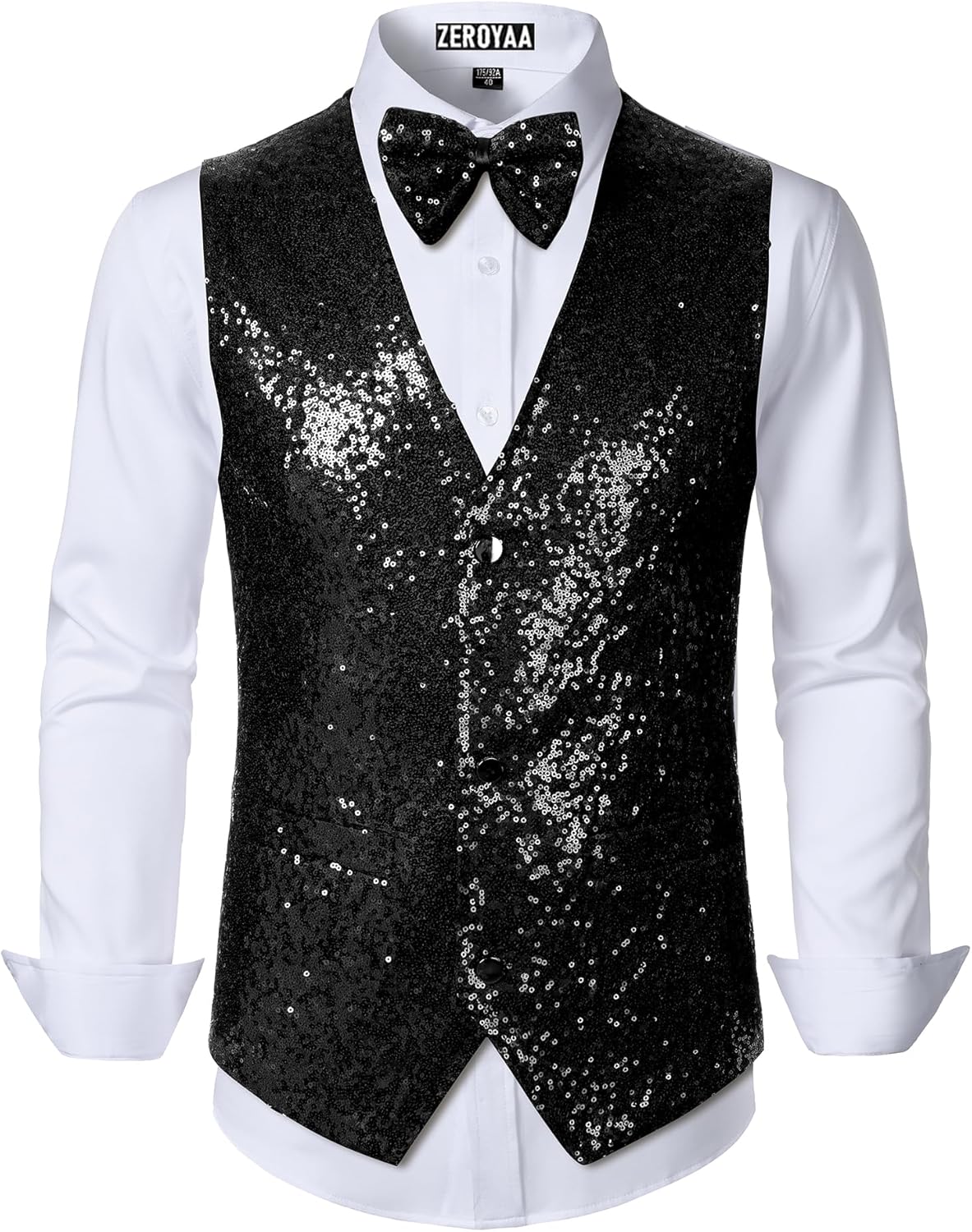 ZEROYAA Men's Sequin Vest Slim Fit 70s Shiny Waistcoat Bowtie Set Disco Prom Party Tuxedo