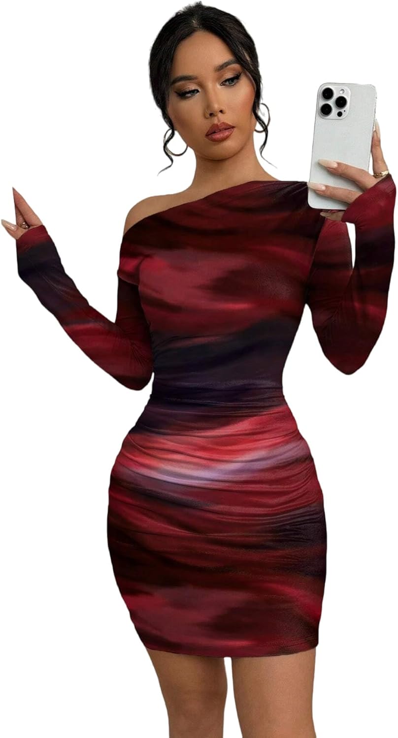 Women's Sexy Off The Shoulder Bodycon Mini Dress Tie Dye Long Sleeve Ruched Asymmetrical Club Dresses (US, Alpha, Medium, Regular, Regular, Red Tie Dye)