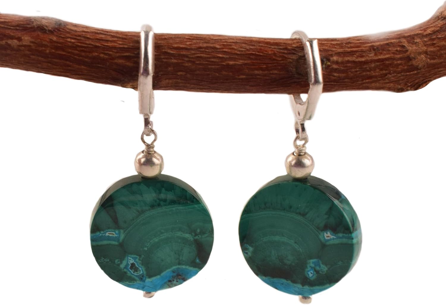 Natural Malachite Drop Earrings – Round Green Gemstone Dangle Earrings for Women – Handmade Leverback Statement Jewelry – Boho Crystal Earrings Gift – Silver Plated