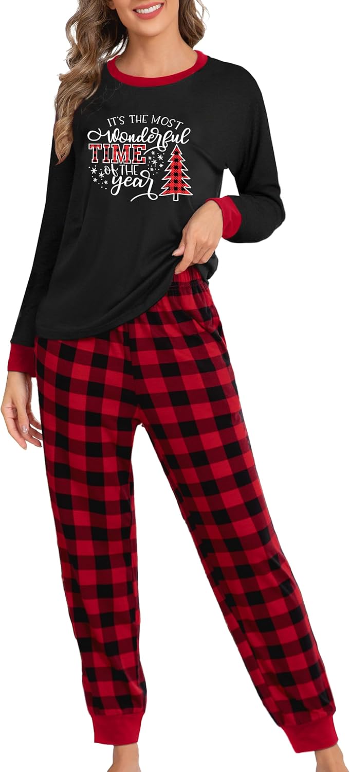 Christmas Pajamas for women Merry and Bright Christmas Long Sleeve Pjs Sleepwear Lounge Set Plaid Pants Xmas Jammies