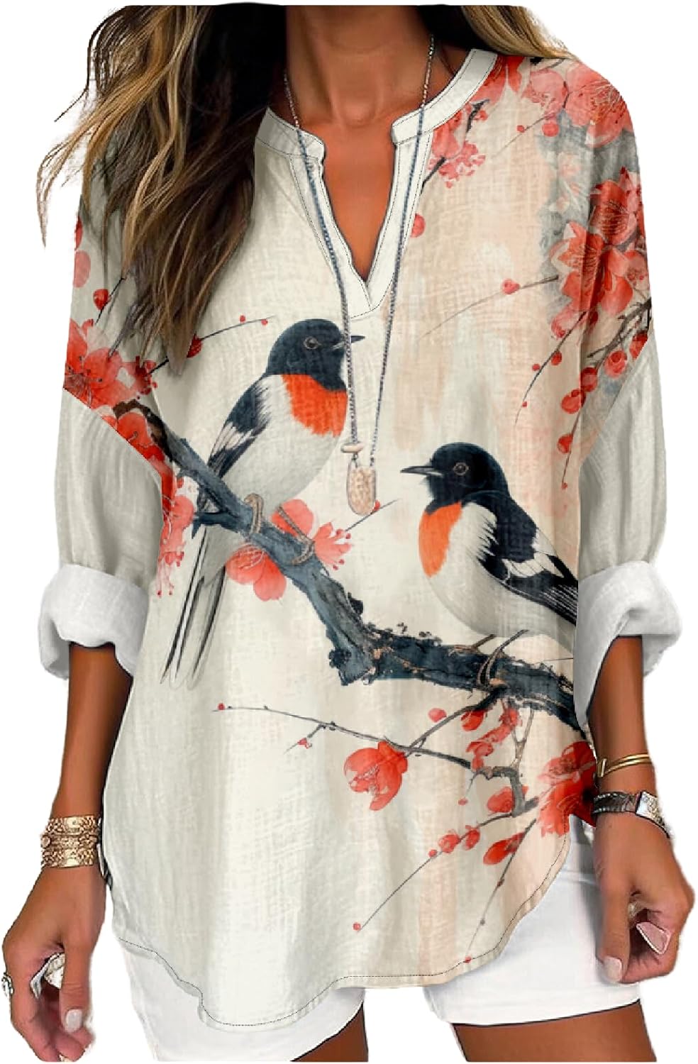 MARSVOVO Japanese Art Style Shirt for Women Long Sleeve Novelty Graphic Tops V Neck Oversize Vintage Causal Pullover