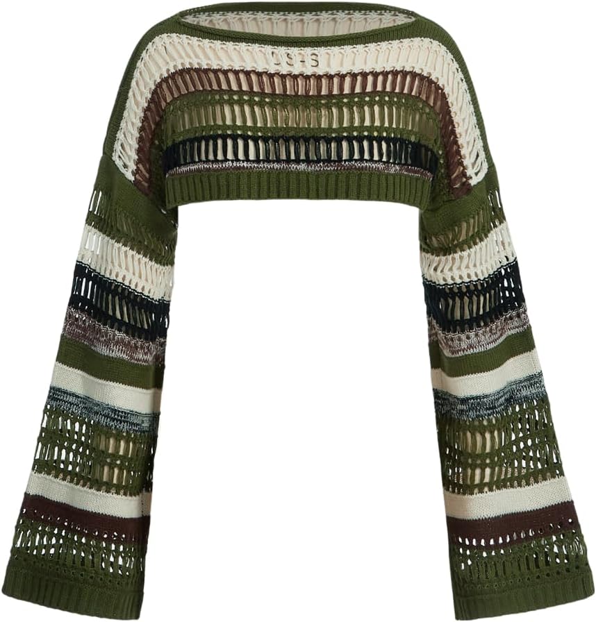 SHENHE Women's Crochet Shrugs Striped Long Bell Sleeve Baggy Knit Sweater Crop Top Swim Coverup Fairy Party
