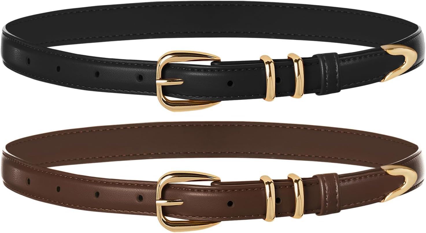 Belle Poque 2 Pack Women Skinny Leather Belts Fashion Ladies Thin Waist Belt with Gold Buckle for Jeans Pants Dresses